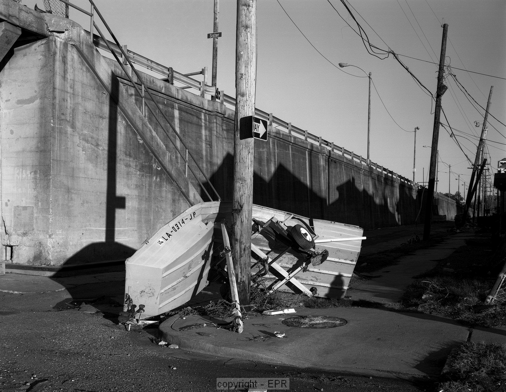 The structure to the left is the street from a bridge over the Industrial Canal. The camera was placed on the edge of the canal levee, looking away from the canal. There is a cut through the elevated street just off camera to the left. The breach in the levee was on the other side of the highway, and water rushed through the cut, sweeping this boat and trailer through the cut and wrapping it around the telephone pole. The water level was about as high as the one way sign on the pole.